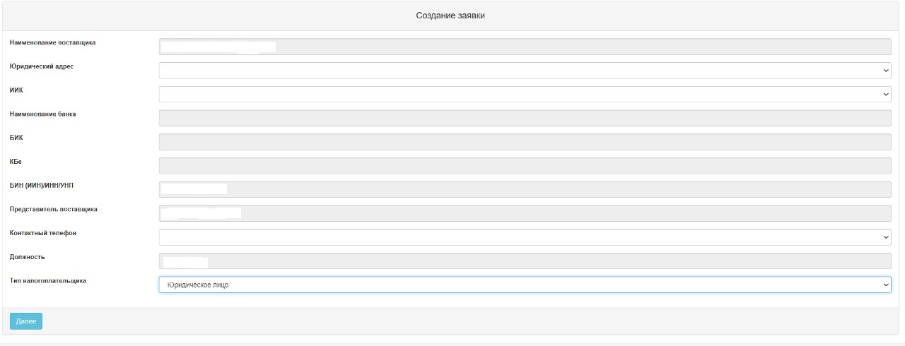 После заполнения обязательных полей необходимо нажать на кнопку «Далее». Система направляет запрос в ИС ИСНА для получения данных о приостановлении деятельности. Для этого в поле "Тип налогоплательщика" необходимо выбрать соответствующий тип "Юридическое лицо" или "Индивидуальное предпринимательство (совместное)".