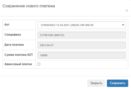 Если заказчик отмечает признак «Авансовый платеж», то выбор акта недоступен. В таком случае система сохраняет данный платеж как авансовый
