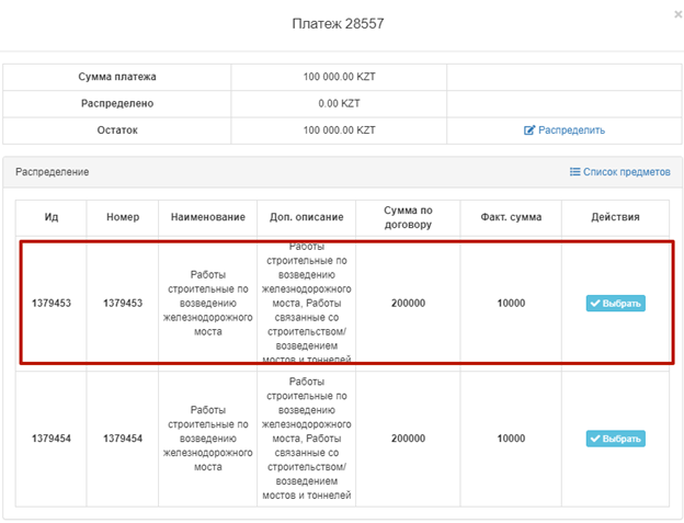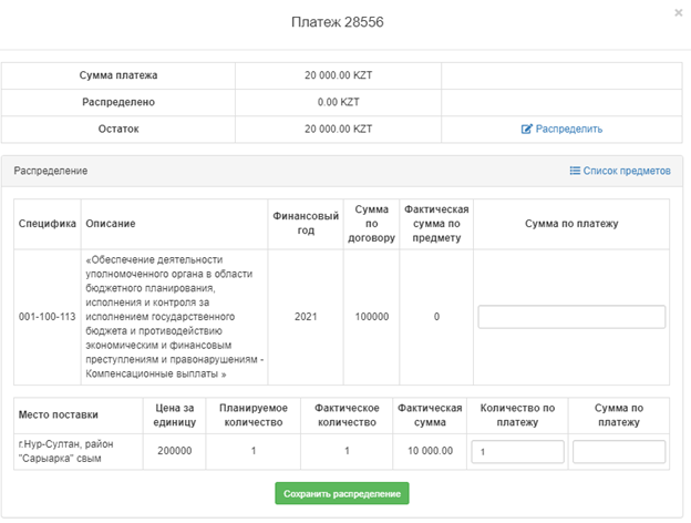 После привязки (ГУ со спецификами) или добавления платежа (не ГУ или ГУ без специфик) Заказчику доступно действие по распределению фактических сумм «распределить»