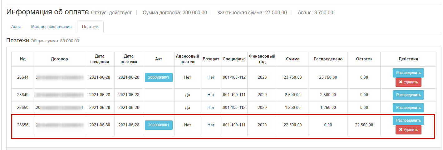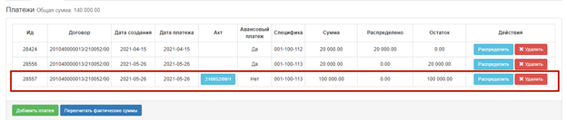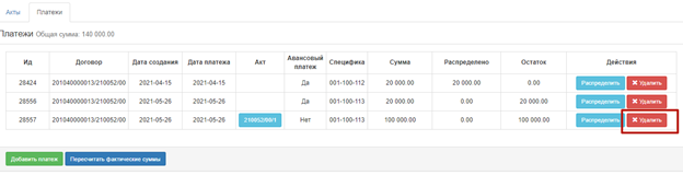 Примечание: после удаления платежа и распределения необходимо повторно корректно добавить/привязать платеж и выполнить распределение