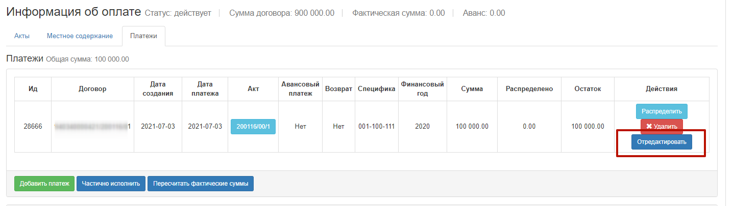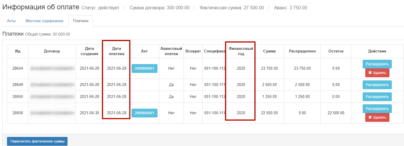 ВАЖНО: действие «Пересчитать фактические суммы» используется для ранее распределенных сумм в договоре на основе сумм в актах. При наличии утвержденных актов с момента запуска функциональности распределения по платежам, после нажатия «Пересчитать фактические суммы» фактические суммы обнулятся. Далее необходимо выполнить добавление/привязку платежей (как указано в текущем разделе инструкции) и выполнить распределение на основе платежей с данными электронных актов