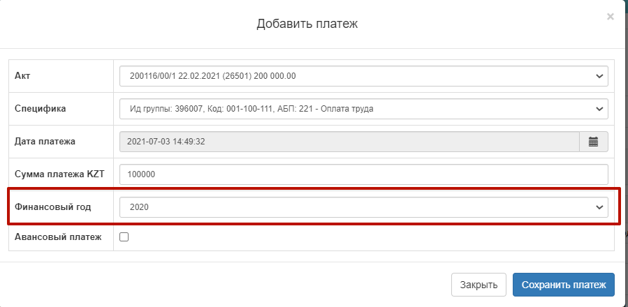 При добавлении платежа необходимо указать Заказчику финансовый год платежа.