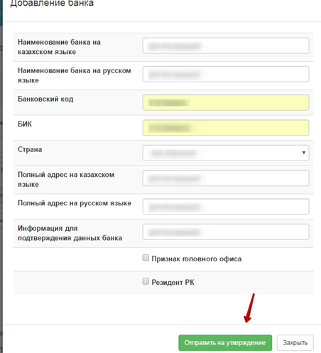 Далее отобразится форма заполнения добавления банка, где необходимо заполнить разделы: Наименование банка на русском и каз. языках, банковский код, БИК, страна, полный адрес на русском и каз. языках, информацию для подтверждения данных банка и признаки.