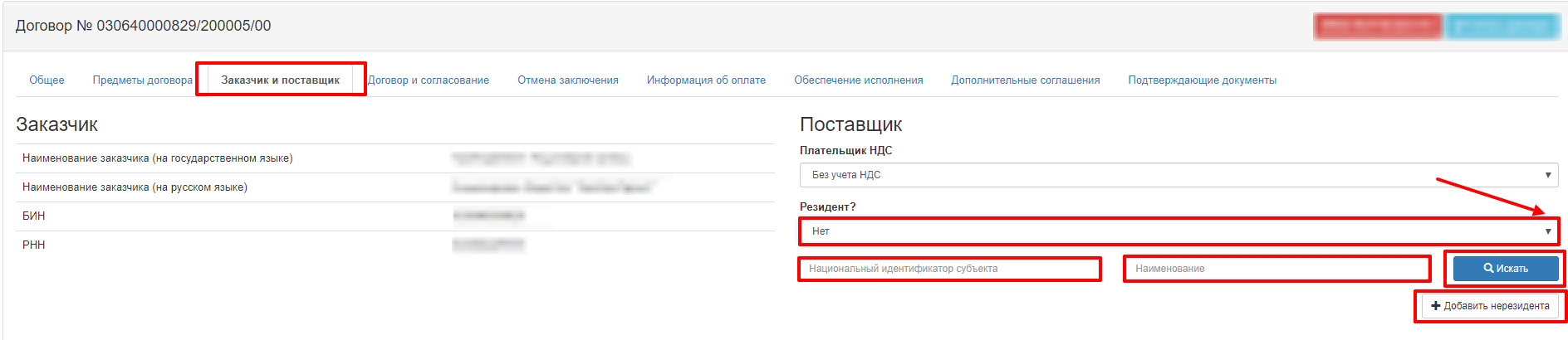 При создании договора с поставщиком-нерезидентом, незарегистрированного в РК, необходимо указать "Нет" в поле «Резидент?» в разделе «Заказчик и поставщик».
