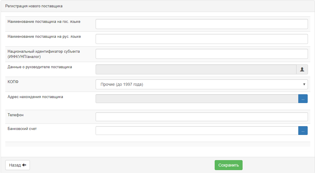 После заполнения данных о поставщике необходимо нажать на кнопку «Сохранить». Далее, чтобы продолжить работу с договором необходимо нажать на кнопку «Назад».