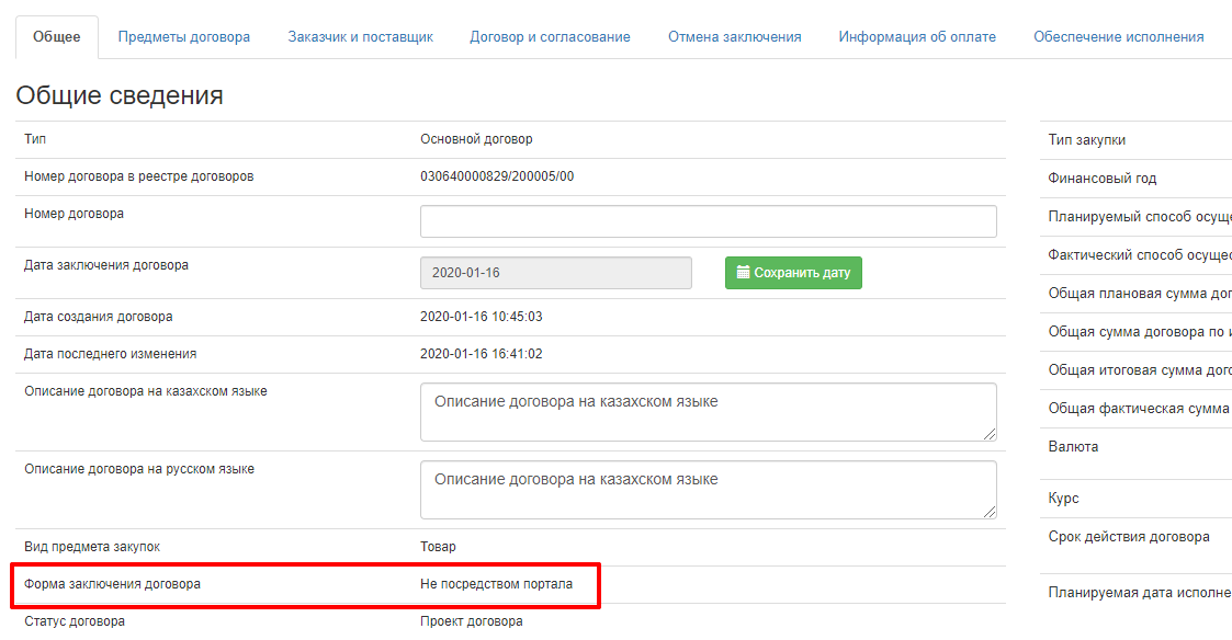 Внимание! После создания договора способом "Из одного источника путем прямого заключения (не ГЗ)" по обоснованиям 1), 3), 5), 6), 13), 14), 16), 23), 27)  пункта 287  применения способа или выбора поставщика-нерезидента система автоматически меняет форму заключения договора на "Не посредством портала". При этом, система позволяет сменить  форму заключения договора на "Типовая форма"