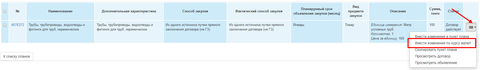 Внимание! Со статусом договора «Действует», если договор заключен в валюте отличной от «KZT», Система позволяет обновить изменения по курсу валют. Для этого необходимо перейти в годовой план и создать проект годового плана (смотрите описание раздела «Внесение изменений в годовой план и пункты плана». Перейти в проект годового плана и выбрать необходимый пункт плана со статусом «Договор действует». Нажать на кнопку «Внести изменения по курсу валют».