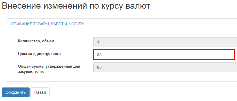 Далее необходимо сохранить введенную сумму договора в валюте. Система пересчитывает по договору значения: общая сумма договора в тенге, цену за единиу (в тенге), Цена за единицу в иностранной валюте. Выполняет проверку: сумма по предмету договора (в тенге) не должна превышать плановую сумму.