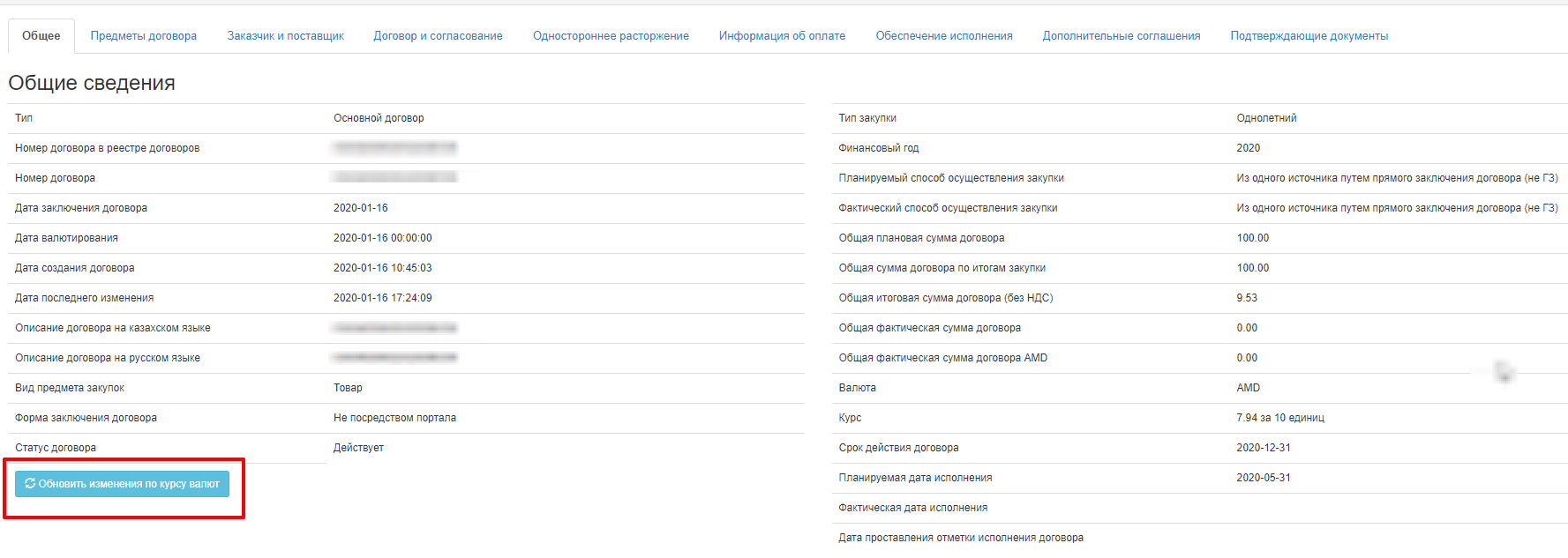 Далее необходимо перейти в необходимый договор (который был заключен в валюте отличной от KZT). На вкладке «Общие» нажать на кнопку «Обновить изменения по курсу валют».