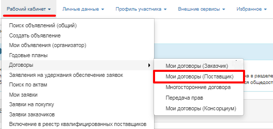 После того, как Заказчик заполнит договор и отправит на согласование, Поставщик для согласования договора проходит в раздел «Мои договоры», меню «Рабочий кабинет».