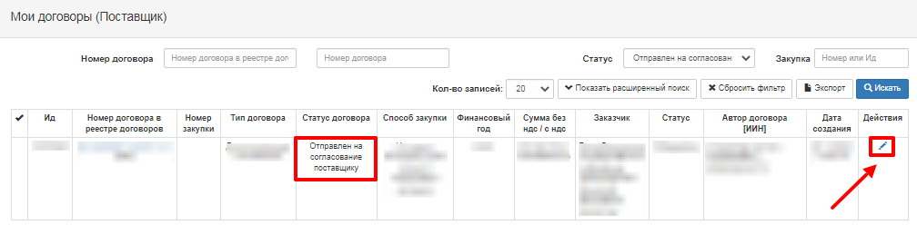 Статус договора соответствует статусу «Отправлен на согласование поставщику».  Для того, чтобы открыть договор необходимо нажать на пиктограмму .