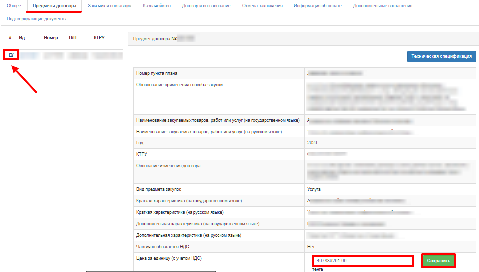 Примечание: Согласно ст.45 закона о государственных закупках  внесение изменения допускается в части уменьшения суммы проекта договора. Поставщик может инициировать изменение суммы договора путем уменьшения значения поля «Цена за единицу» во вкладке «Предметы договора».