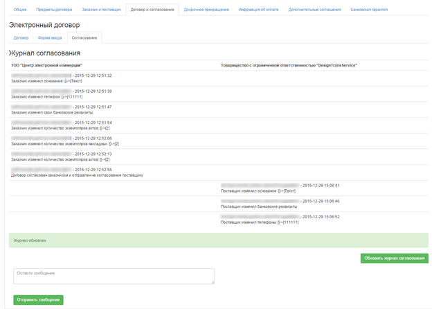Во вкладке «Согласование» отображаются действия Заказчика и Поставщика по согласованию.