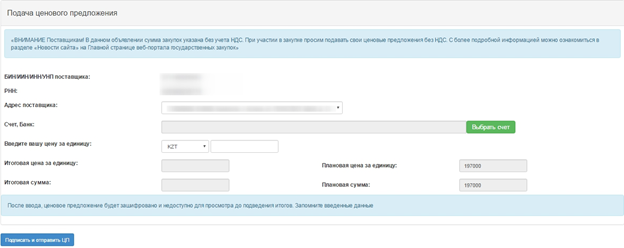 Назар аударыңыз! Баға ұсынысына қол қою алдында енгізілген деректердің дұрыстығын мұқият тексеріңіз. Баға ұсынысын жібергеннен кейін, берілген баға қарау үшін қолжетімді болмайды.