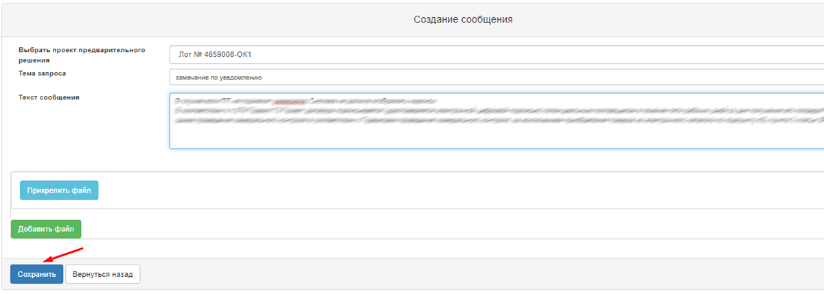 Сатып алуға қатысушылар алдын ала шешімнің жобасы бекітілген күннен бастап екі жұмыс күні ішінде мемлекеттік сатып алу веб-порталы арқылы келіспейтіні туралы өз ұстанымын білдіре алады, Жүйе «Басшы» рөлі бар пайдаланушы үшін «Тыңдау» қойындысында «Хабарлама құру» батырмасын көрсетеді.