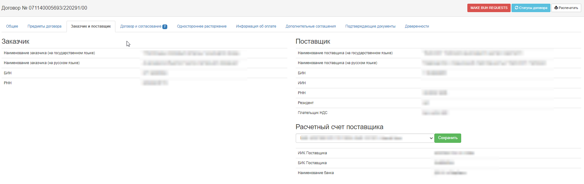 Қосылу шартында өзінің банктік деректемелерін өзгерту үшін Өнім берушіге шарт карточкасында «Тапсырыс беруші және Өнім беруші» қосымша бетіне өту қажет