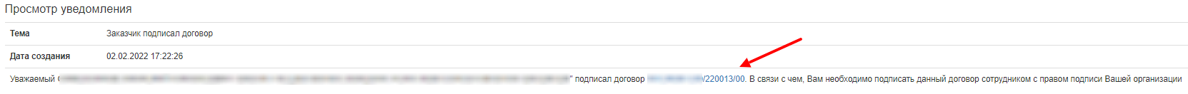 Егер шартқа Тапсырыс беруші қол қойса, Жүйе Өнім берушіге шартқа қол қою қажеттілігі туралы хабарлама жібереді. Хабарламаны қарау нысанында шарт карточкасына өту үшін шарт нөмірі бар сілтемені басу қажет.
