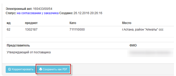 «PDF форматында сақтау» батырмасын басқан кезде жүйе пайдаланушының өнім беруші актісінің деректерімен сақталуы үшін PDF файлын құрайды