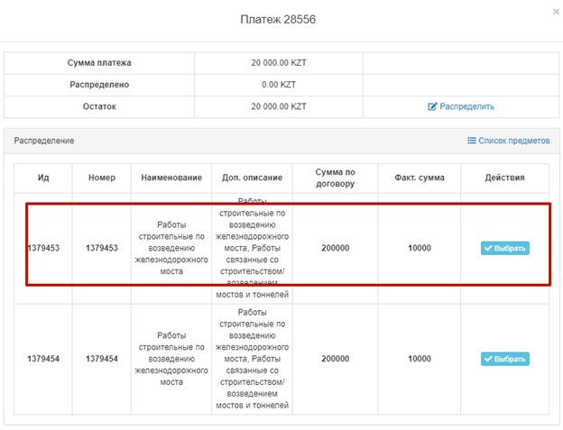 Жүйе әр ерекшелік бойынша алынған төлемдерді «Төлем туралы ақпарат» - «Төлемдер» қосымша бетінде және «Төлемді байланыстыру» әрекетінде көрсетеді. Тапсырыс берушіге төлемдер тізімінде мынадай жолдар көрсетіледі: