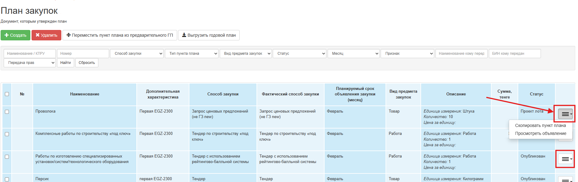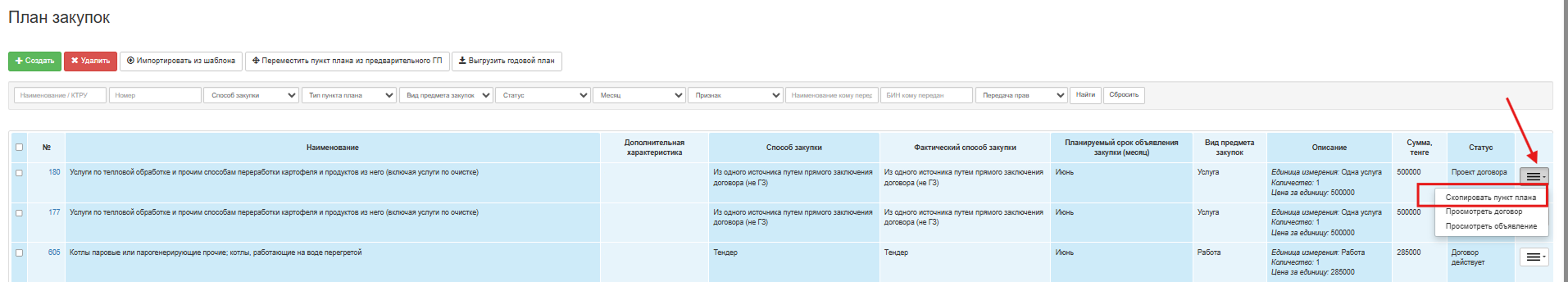 Для копирования пункта плана выберите из выпадающего списка действие «Скопировать пункт плана».