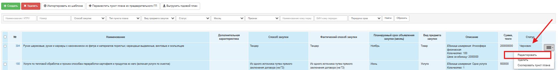 Для редактирования пункта плана выберите из выпадающего списка действие «Редактировать». Редактирование возможно по пунктам плана со статусом «Черновик».