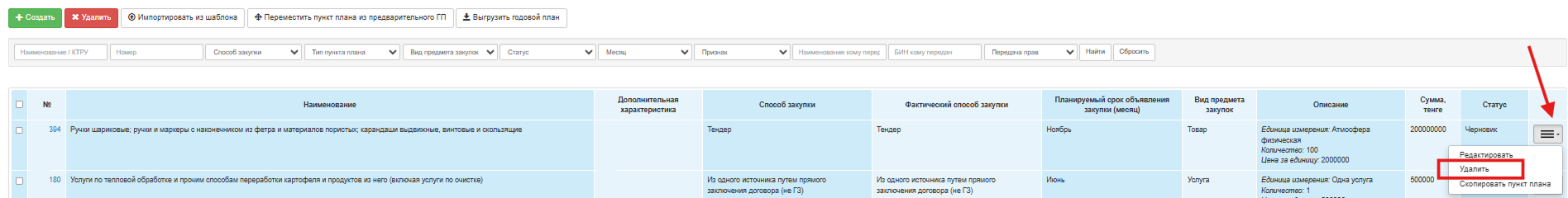 Для удаления нескольких пунктов плана отметьте галочкой необходимые пункты плана и нажмите на кнопку «Удалить».
