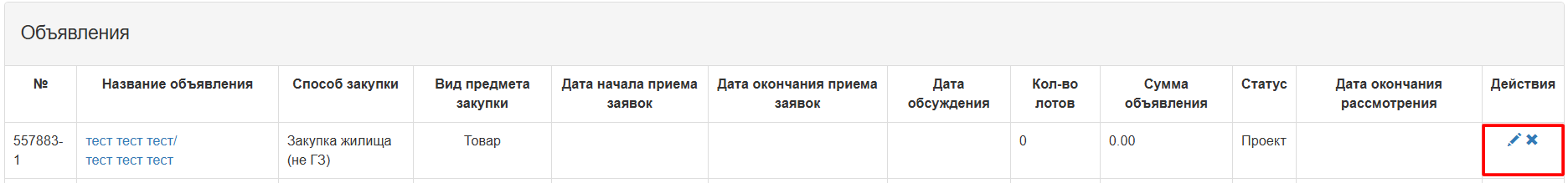 Пиктограмма позволяет редактировать, пиктограмма позволяет удалить объявления со статусом «Проект»