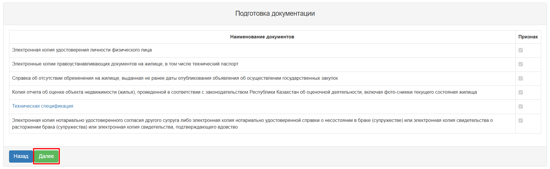 Для подготовки документации необходимо нажать на кнопку «Далее».