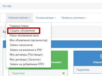 Для создания объявления способом «Закупка жилища (не ГЗ)» необходимо перейти в раздел «Рабочий кабинет» - «Создать объявление»