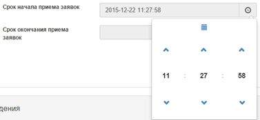 В данной форме необходимо указать сроки публикации закупки. Закупка жилья публикуется не менее чем на 5 рабочих дней, при этом дата начала приема заявок должна быть позднее текущей даты. Для того чтобы указать даты, необходимо нажать на пиктограмму .