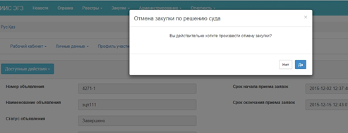 Функционал отмены закупки доступен пользователю, опубликовавшему закупку, с момента публикации объявления до заключения договора, в связи с установлением нарушения законодательства о государственных закупках по акту: