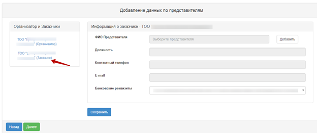 При нажатии на кнопку «Далее» открывается форма для добавления представителя организатора и заказчика, а также для выбора банковского счета.