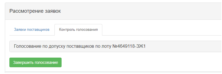 При наличии кворума голосов по допуску/отклонению поставщиков Секретарю конкурсной комиссии во вкладке «Контроль голосования» становится доступным кнопка «Завершить голосования».