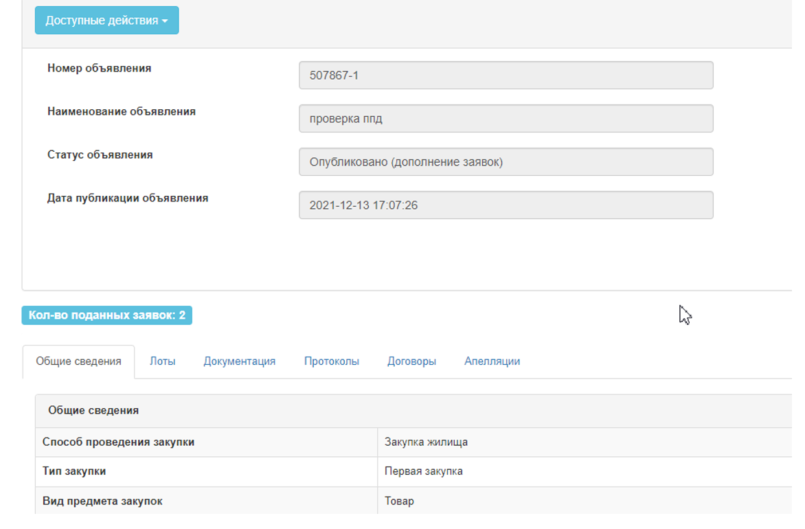 Создателю объявления на форме просмотра объявления со статусом «Рассмотрение заявок»/«Рассмотрение дополнений заявок» доступен функционал отслеживания хода голосования. Для использования данного функционала необходимо в разделе «Доступные действия» выбрать пункт «Просмотреть заявки».