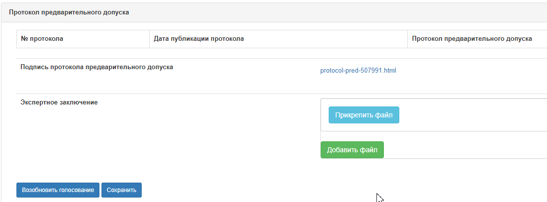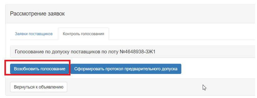 Внимание! После формирования протокола предварительного допуска доступно возобновление голосование.
