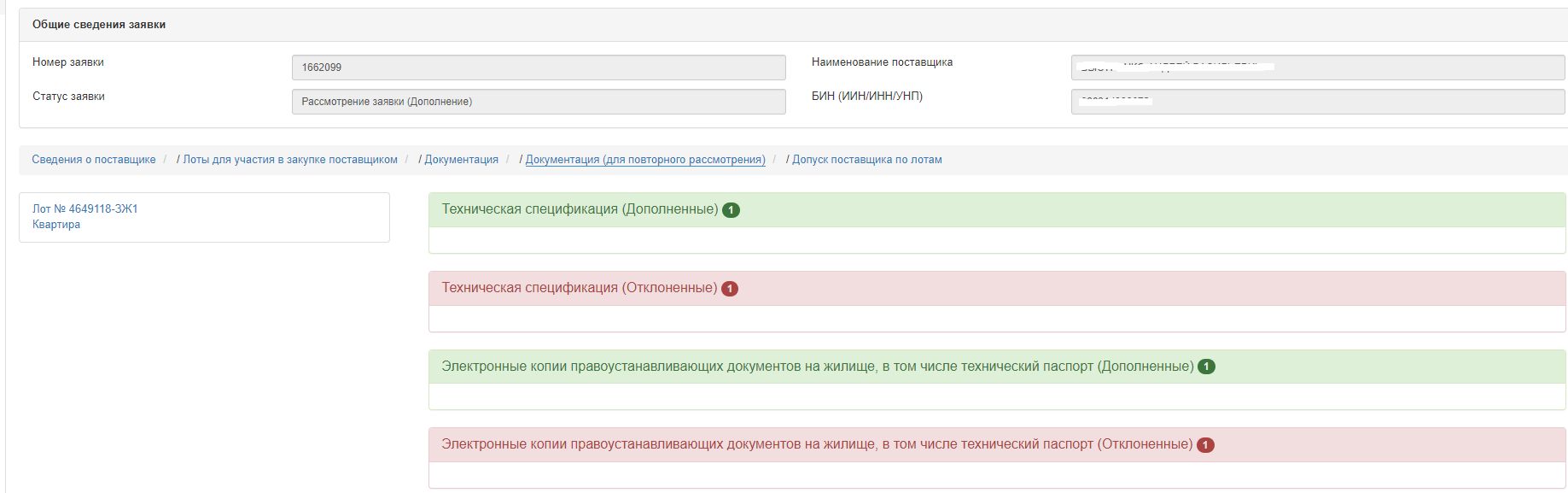 Системой отобразятся только те разделы, и документы в них, по которым поставщик был отклонен.