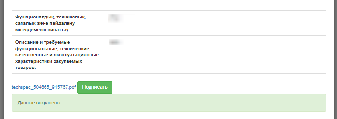 В новом окне пользователю отобразится шаблон технической спецификации, где отображается информация о лоте с обязательным заполнением Описания и требуемые функциональные, технические, качественные и эксплуатационные характеристики закупаемых товаров (работ, услуг) на казахском и русском языке: