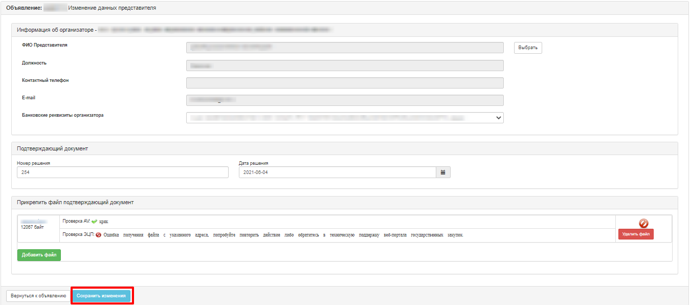 В открывшейся форме изменить данные представителя организатора. Изменение данных представителя организатора аналогично функционалу добавление представителя организатора (см. раздел 1.81. Создание и публикация проекта объявления), за исключением того, что добавились следующие поля (не являются обязательными), которые подтверждают основание изменения сведений о представителе организатора: Номер решения, Дата решения, прикрепление подтверждающего документа.