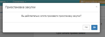 При выборе действия «Приостановить закупку» система выведет всплывающее окно с необходимостью подтверждения действия.