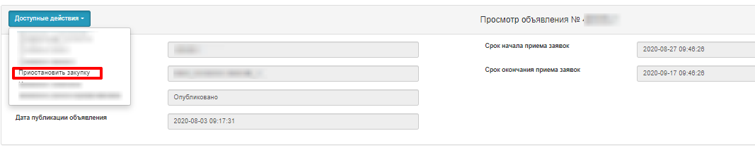 Функционал приостановления закупки доступен со статусами объявления «Опубликовано» и «Рассмотрение заявок». Приостановление закупки делается на всю закупку. Для выполнения приостановления необходимо перейти на форму просмотра закупки в меню «Рабочий кабинет – Мои объявления (организатор)». На форме просмотра закупку необходимо нажать на кнопку «Доступные действия» и выбрать действие «Приостановить закупку».