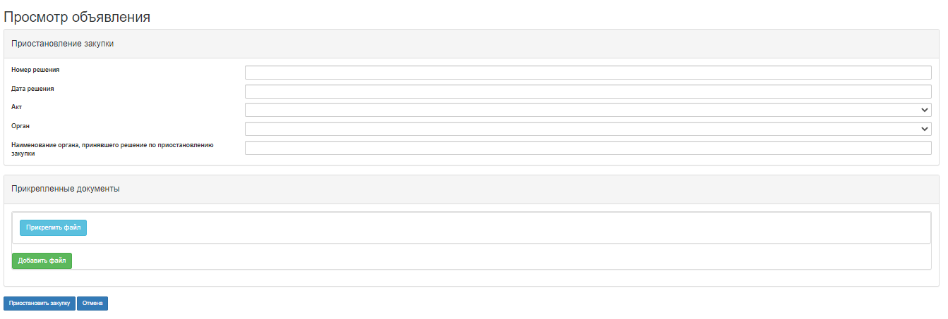 Форма приостановления закупки содержит следующие поля: