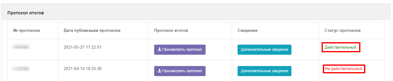 Предыдущий протокол итогов без информации об отмене будет отображаться со статусом «Не действительный». Актуальный протокол итогов с информацией об отмене будет иметь статус «Действительный».