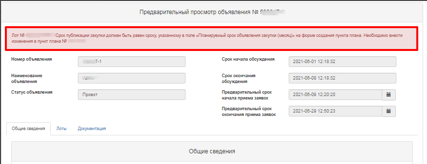 В случае если сроки публикации закупки не соответствует срокам, указанным в пункте плана в поле «Планируемый срок объявления закупки (месяц)», система отобразит соответствующую ошибку: