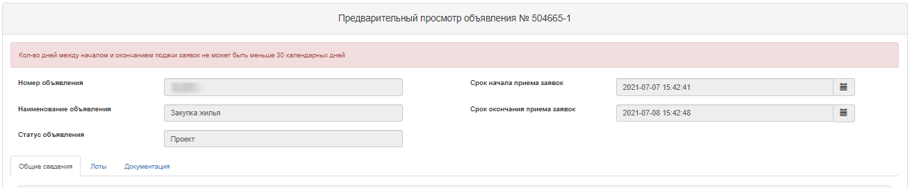 В случае если сроки публикации закупки указаны некорректно, система отобразит соответствующую ошибку: