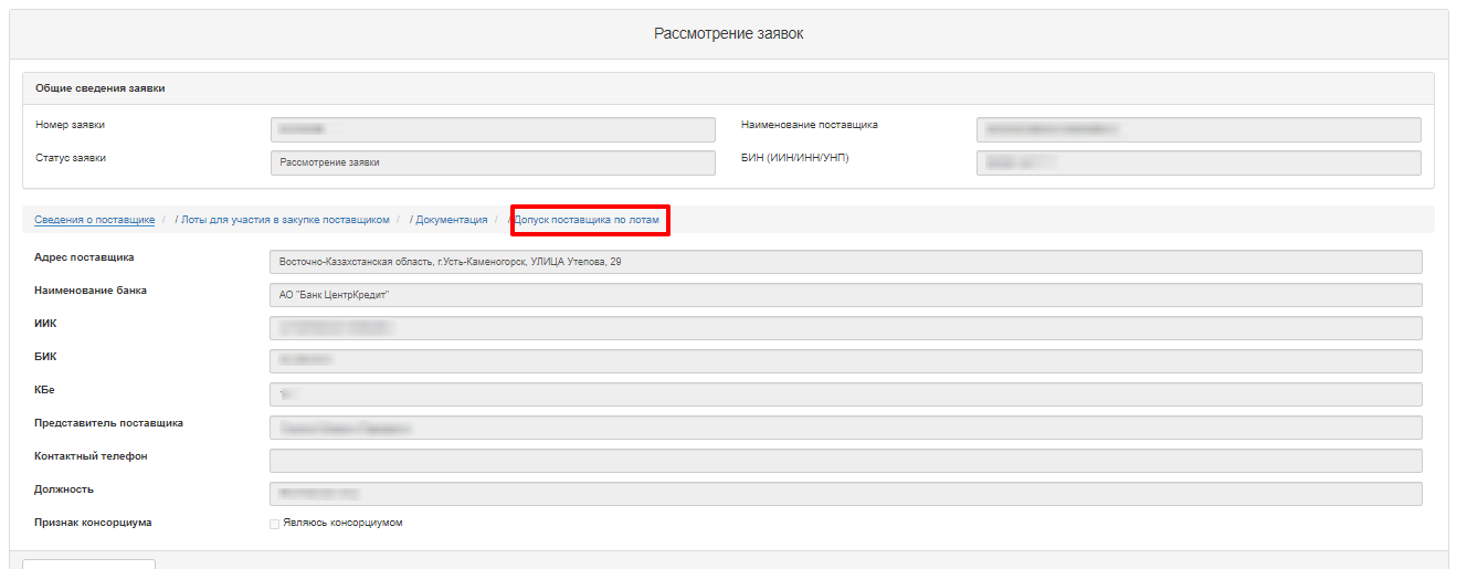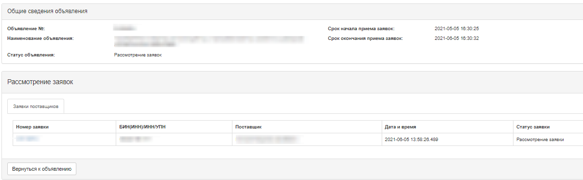 Рассмотрение заявок поставщика