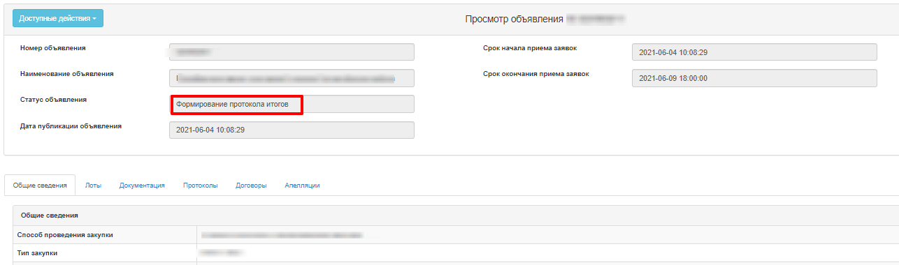 - Изменит статус объявления и лота (-ов), заявок поставщиков на «Формирование протокола итогов»;