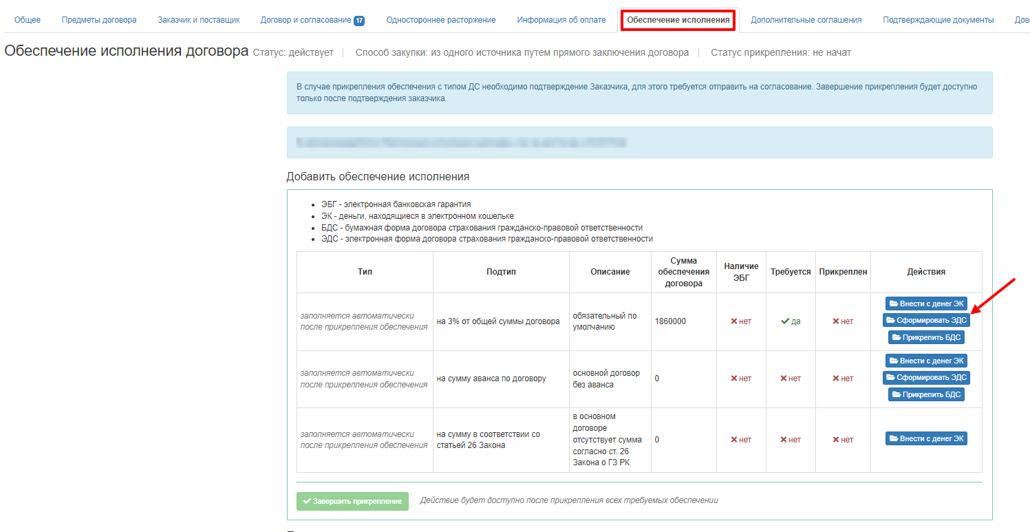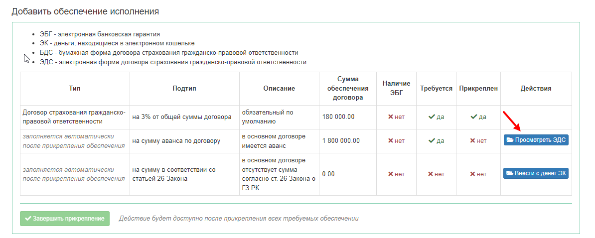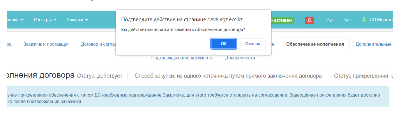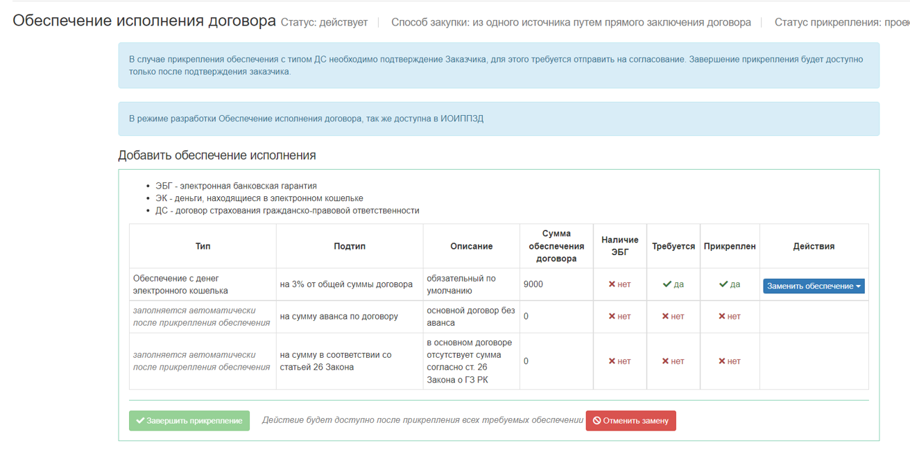 Прикрепление обеспечения исполнения договора выполняется Поставщиком в договорах со статусом «Действует», где фактический способ закупки «Запрос ценовых предложений», «Открытый конкурс», «Аукцион», «Из одного источника по несостоявшимся закупкам» (способ несостоявшейся закупки «Открытый конкурс», «Запрос ценовых предложений», либо «Аукцион»), «Электронный магазин» (если сумма договора превышает 500 МРП) и "Из одного источника путем прямого заключения" только по подпунктам 19) и 41) п. 3 ст. 16 Закона о ГЗ