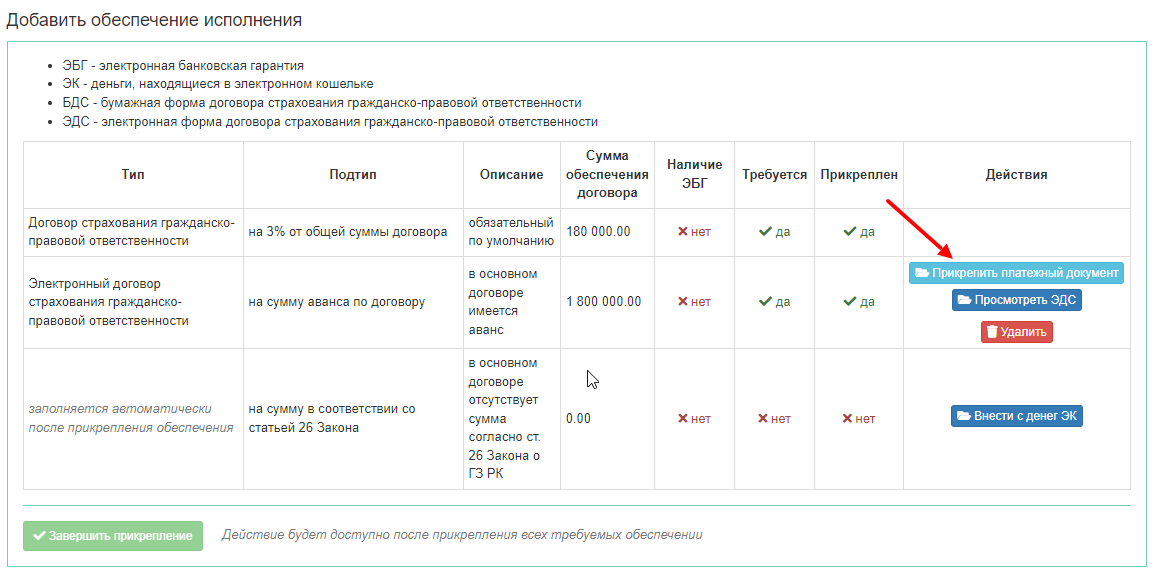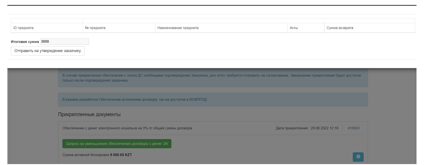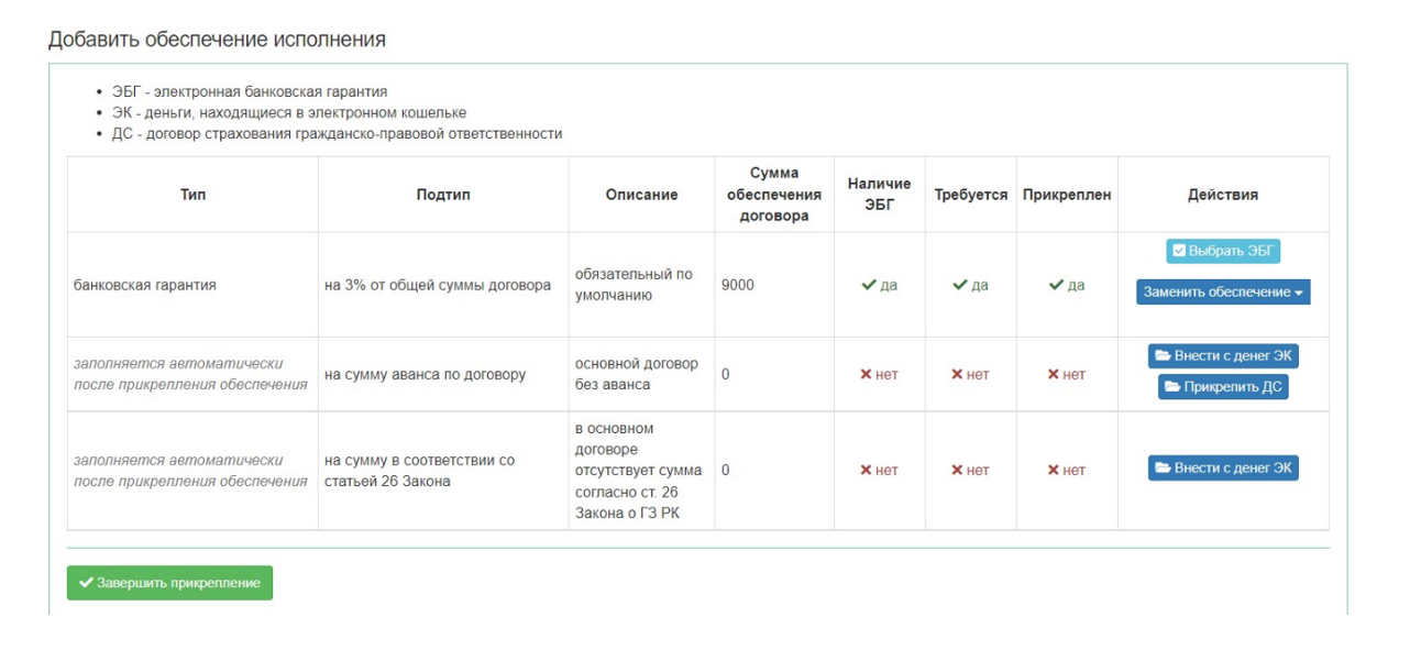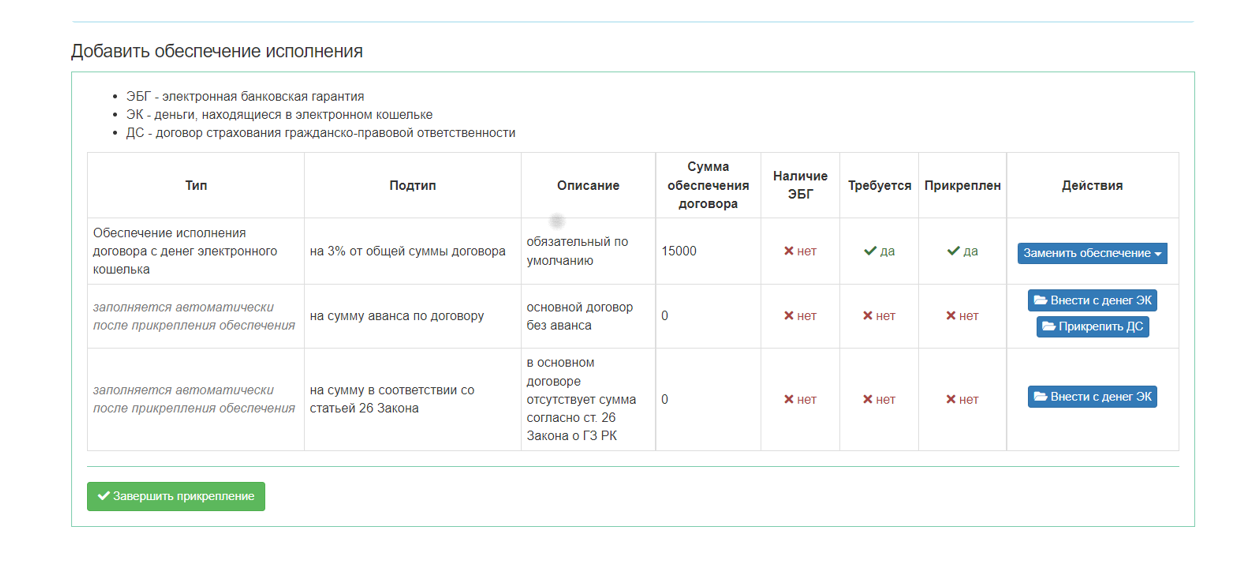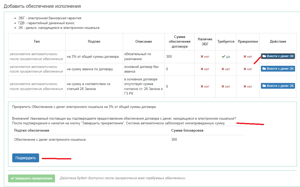 Система позволить внести обеспечение исполнения договора (5 % от суммы договора для способа ЗЦП и 3 % от суммы договора для иных способов), обеспечения аванса (при наличии) и сумму по статье 13 ЗРК (при наличии) с денег, находящиеся в электронном кошельке либо с электронной банковской гарантии.