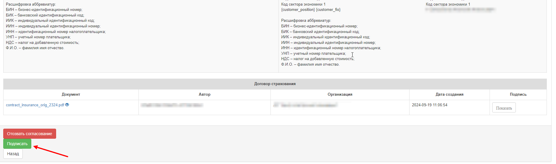 Ескертпе: Шартқа қол қоюға «Басшы (қол қою құқығы)» өкілеттігіне ие қызметкерлер тізбесі ғана құқылы. Өкілеттіктерді қарап шығу үшін «Қатысушы бейіні» - Ұйымның қызметкерлері бөліміне өту қажет.