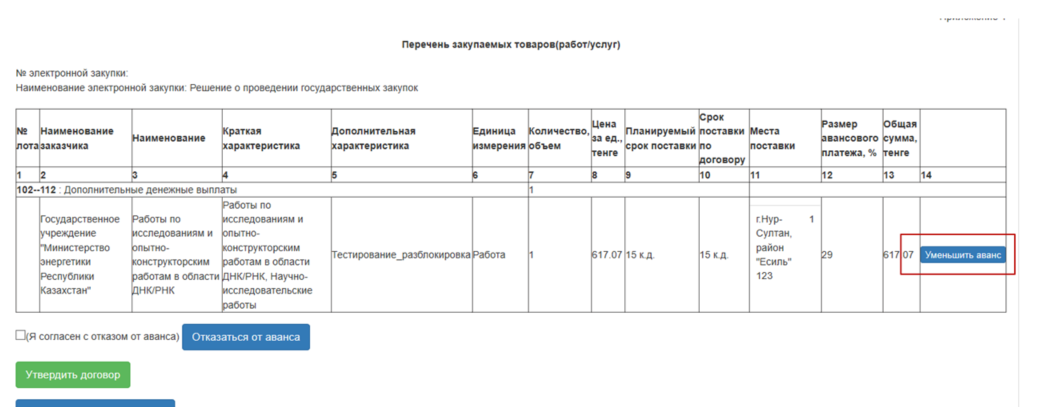 Өнім беруші авансты төлеуден бас тартуға құқылы. Бұл үшін шарттың келісу сатысында (шарттың мәртебесі «Өнім берушіге келісуге жіберілді»), Өнім берушіге «Шарт және келісу» қосымша бетінде (Шарт ішкі қосымша бет) «Аванстан бас тартумен келісемін» жолында қанатбелгісін қойып, «Аванстан бас тарту» батырманы басу қажет.